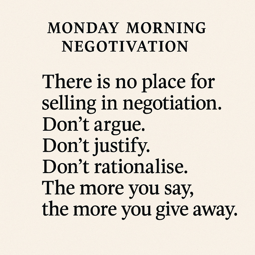 "There is no place for selling in negotiation. Don’t argue. Don’t justify. Don’t rationalise. The more you say, the more you give away."